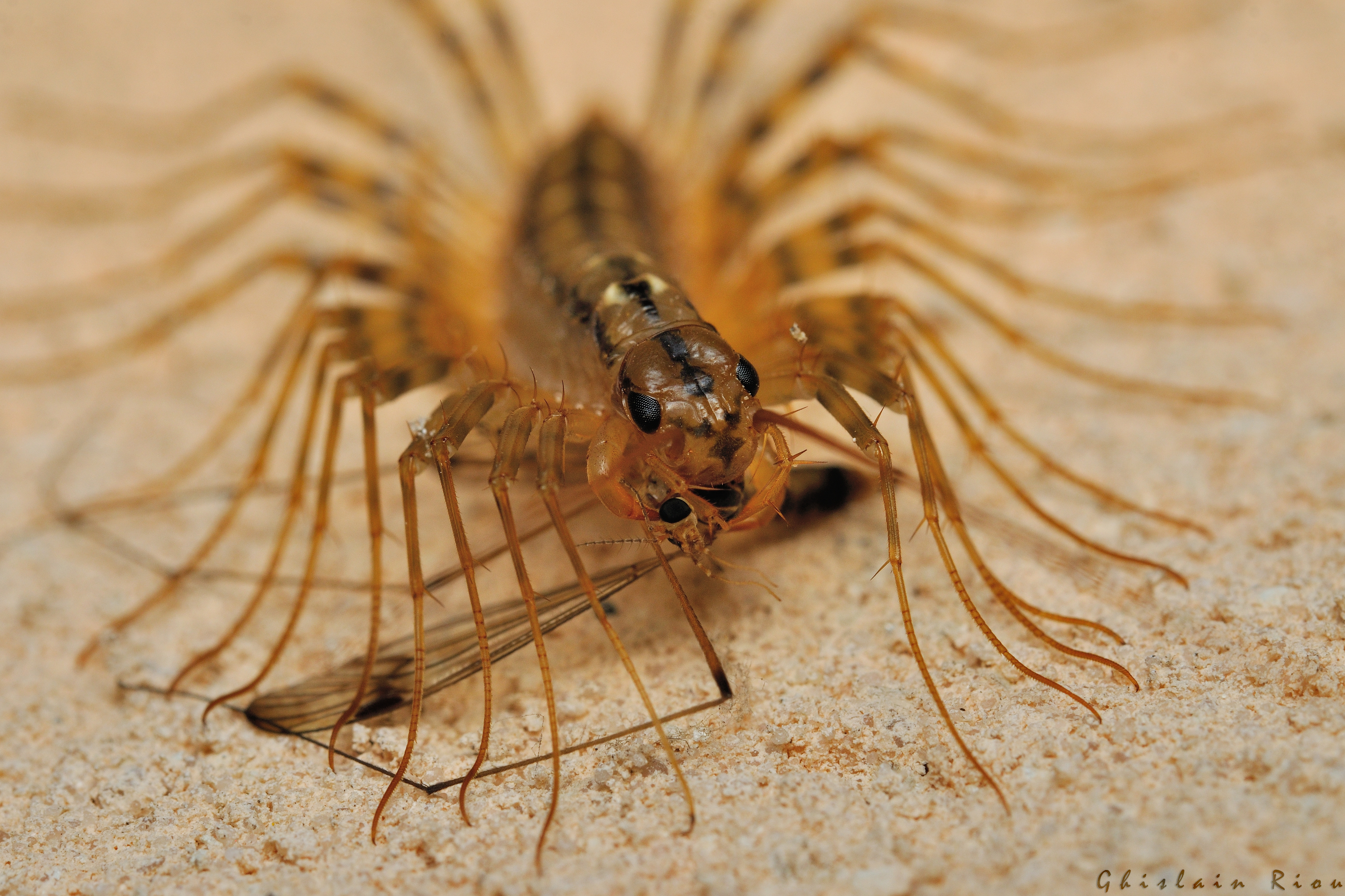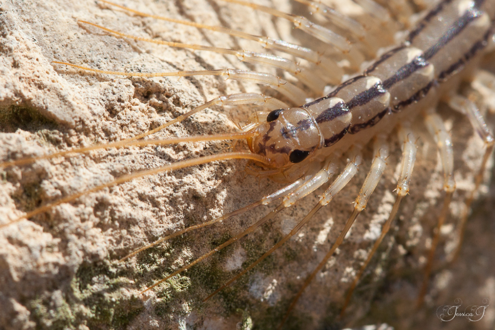 Cette espèce est inconfondable : si vous voyez courir très vite, souvent de nuit sur les murs, un animal ressemblant à un « mille pattes » avec des pattes démesurément longues et très fines (ses antennes ont également le même aspect), à coup sûr c’est elle ! Pour compléter la description, sa couleur est d’un joli jaune marron brillant avec des bandes noires sur le dos, et sa longueur totale peut atteindre 3 ou 4 cm. Lorsqu’on a la chance de la voir assez longtemps et de près, on se rend compte que le nombre de paires de pattes n’est « que » de 15.